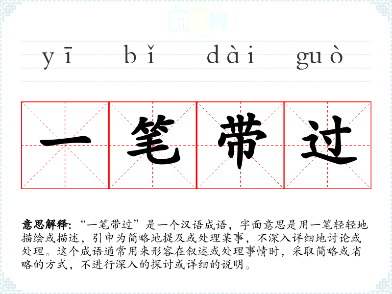 “一笔带过”是一个汉语成语,字面意思是用一笔轻轻地描绘或描述,引申为简略地提及或处理某事,不深入详细地讨论或处理。这个成语通常用来形容在叙述或处理事情时,采取简略或省略的方式,不进行深入的探讨或详细的说明。
