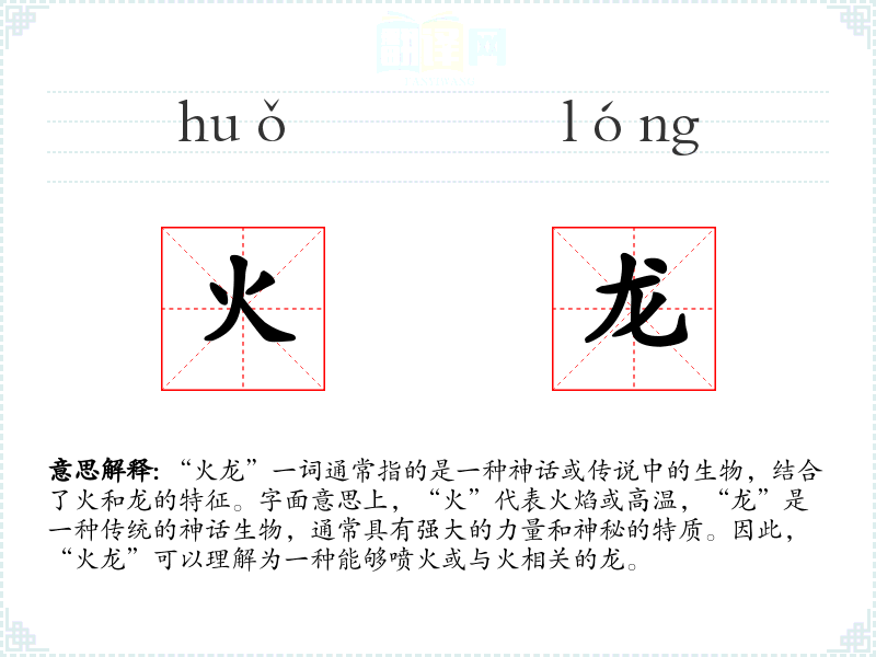 “火龙”一词通常指的是一种神话或传说中的生物,结合了火和龙的特征。字面意思上,“火”代表火焰或高温,“龙”是一种传统的神话生物,通常具有强大的力量和神秘的特质。因此,“火龙”可以理解为一种能够喷火或与火相关的龙。