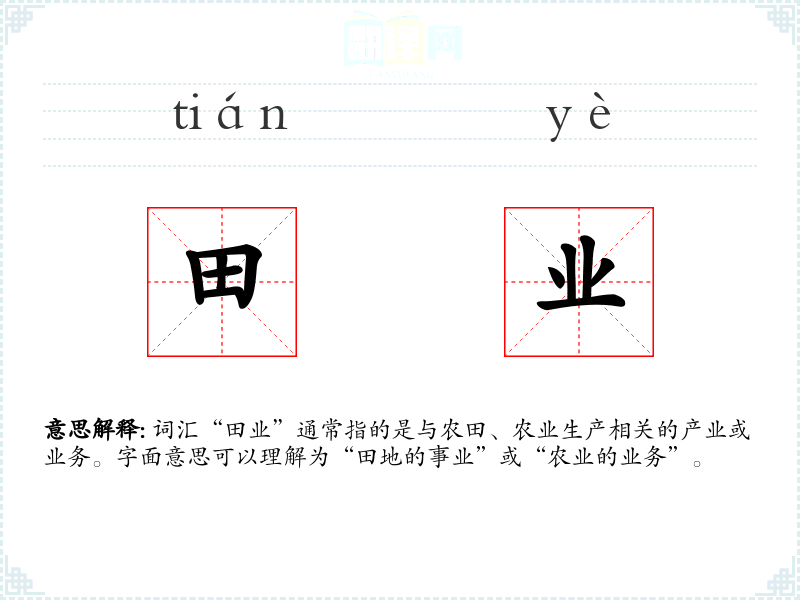 词汇“田业”通常指的是与农田、农业生产相关的产业或业务。字面意思可以理解为“田地的事业”或“农业的业务”。