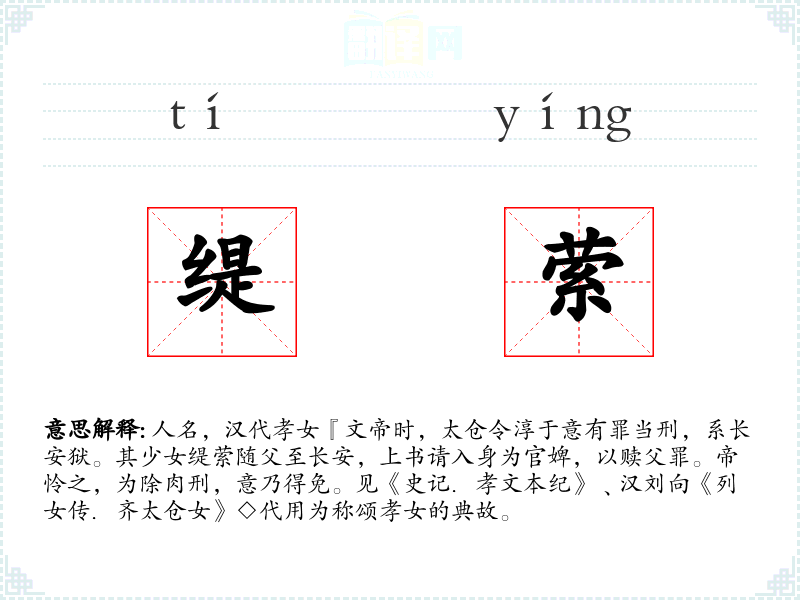 1.人名,汉代孝女『文帝时,太仓令淳于意有罪当刑,系长安狱。其少女缇萦随父至长安,上书请入身为官婢,以赎父罪。帝怜之,为除肉刑,意乃得免。见《史记.孝文本纪》﹑汉刘向《列女传.齐太仓女》◇代用为称颂孝女的典故。