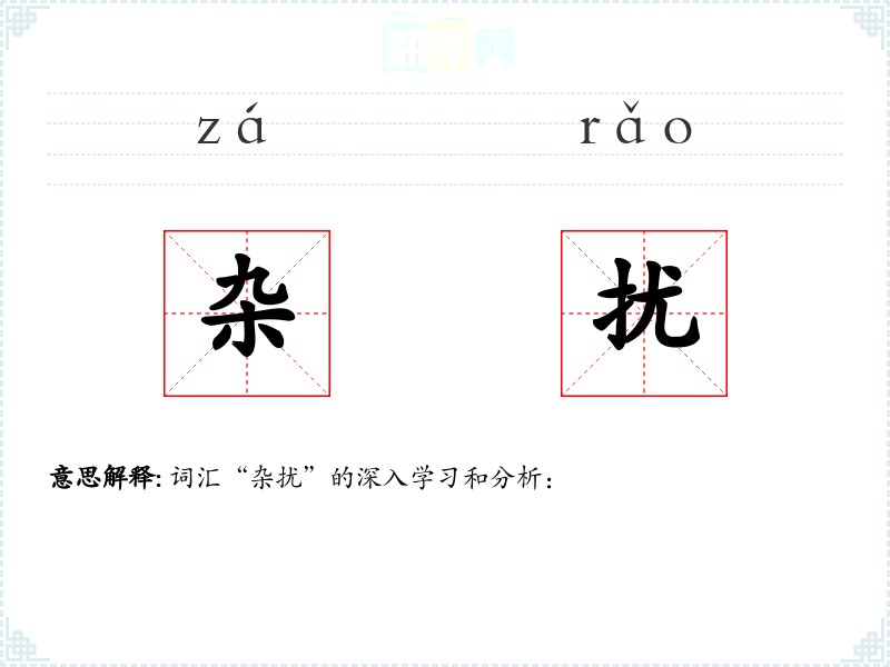 “杂扰”由“杂”和“扰”两个字组成。“杂”字古义为混杂、不纯,“扰”字则有扰乱、打扰之意。这两个字结合,形成了描述混乱干扰的词汇。