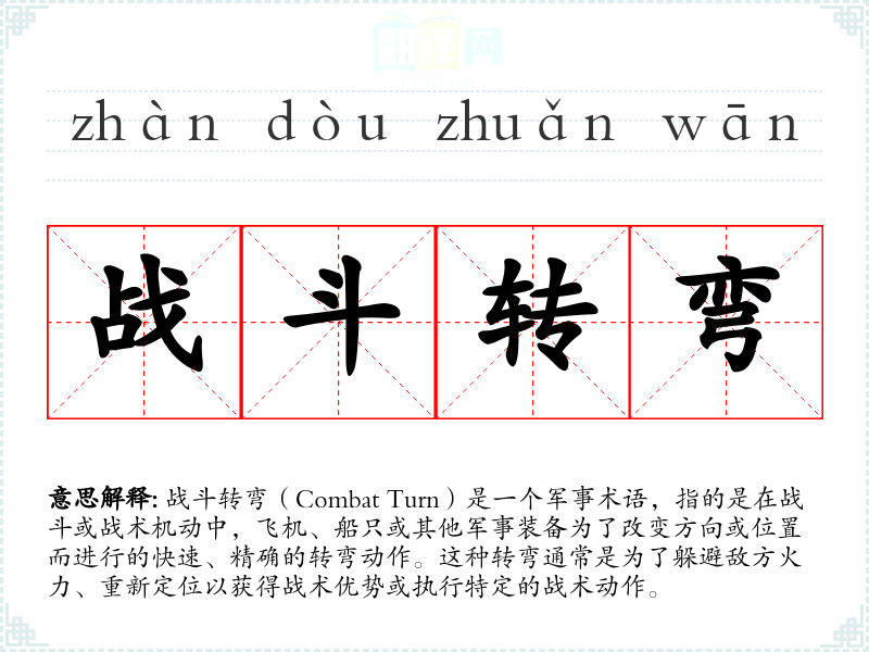 在不同语言中,战斗转弯可能有不同的对应词汇,但其核心意义——快速、精确的转向动作——是普遍的。例如,在英语中,可能对应的是“combat turn”或“tactical turn”。