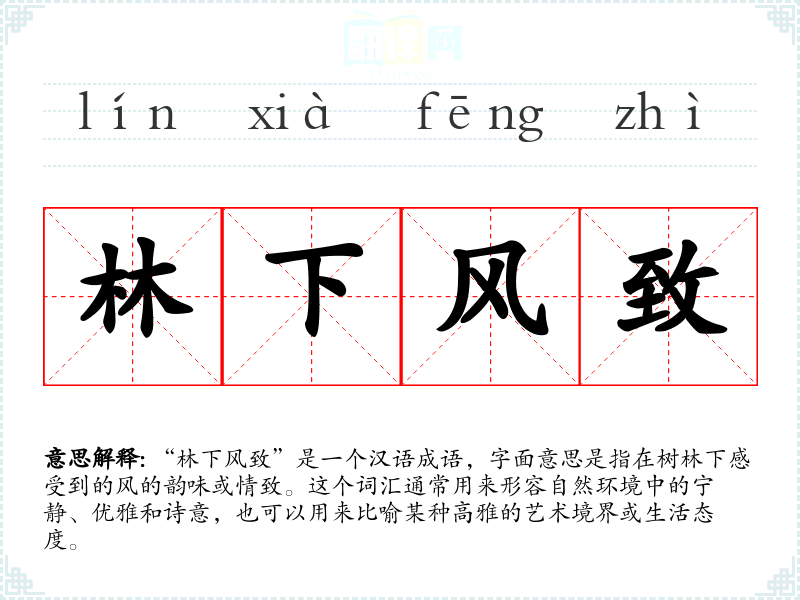 “林下风致”是一个汉语成语,字面意思是指在树林下感受到的风的韵味或情致。这个词汇通常用来形容自然环境中的宁静、优雅和诗意,也可以用来比喻某种高雅的艺术境界或生活态度。