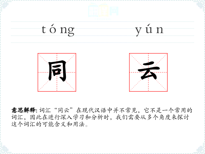 词汇“同云”在现代汉语中并不常见,它不是一个常用的词汇,因此在进行深入学*和分析时,我们需要从多个角度来探讨这个词汇的可能含义和用法。