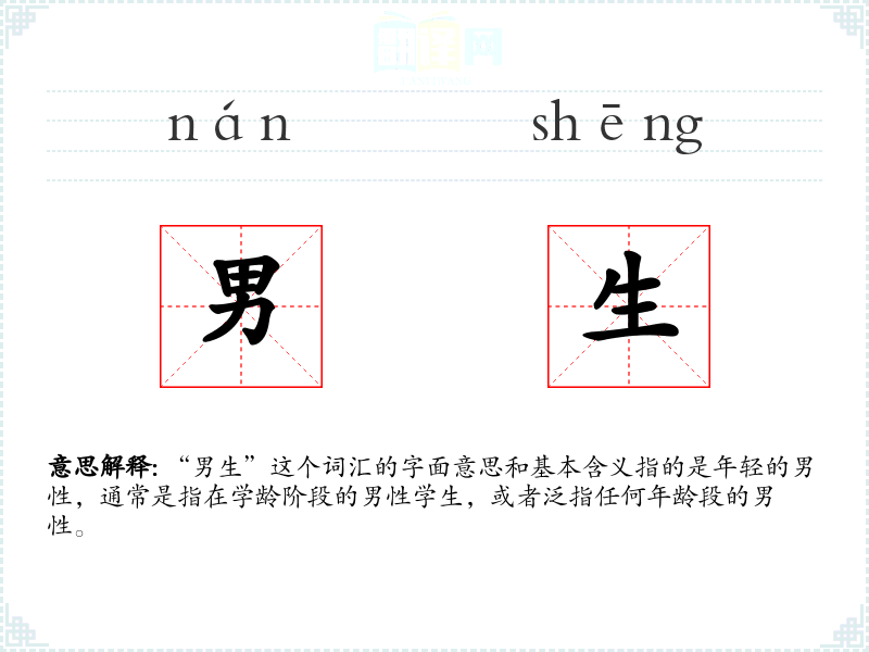 “男生”这个词汇的字面意思和基本含义指的是年轻的男性,通常是指在学龄阶段的男性学生,或者泛指任何年龄段的男性。