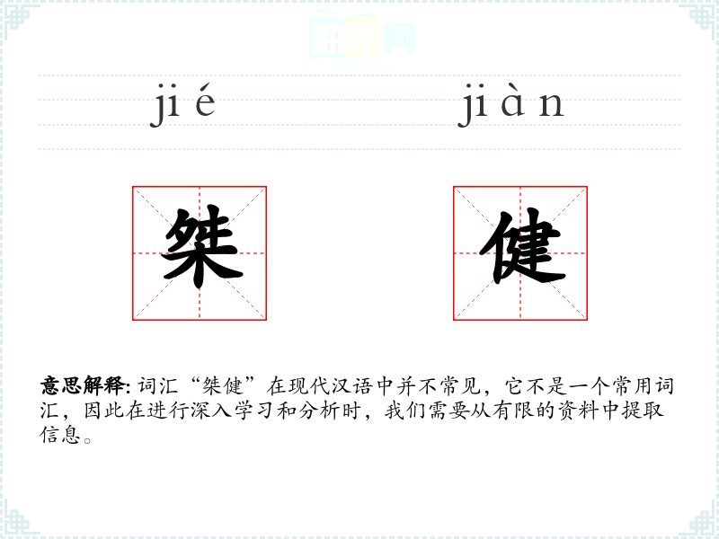 词汇“桀健”在现代汉语中并不常见,它不是一个常用词汇,因此在进行深入学*和分析时,我们需要从有限的资料中提取信息。