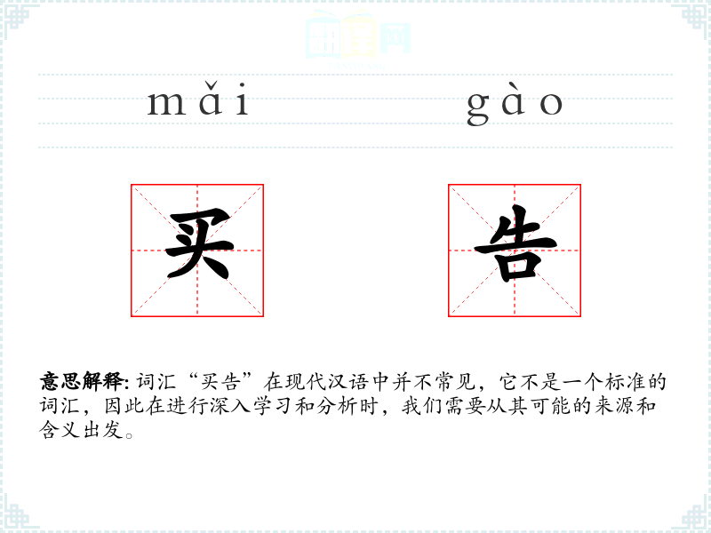 词汇“买告”在现代汉语中并不常见,它不是一个标准的词汇,因此在进行深入学习和分析时,我们需要从其可能的来源和含义出发。
