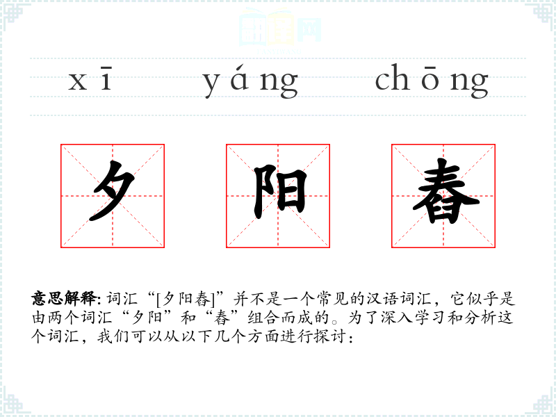“[夕阳舂]”作为一个组合词汇,其意义和用法可能需要根据具体的文学或文化背景来理解。在语言学习和表达中,它可以作为一个创造性的元素,用来丰富表达的层次和深度。