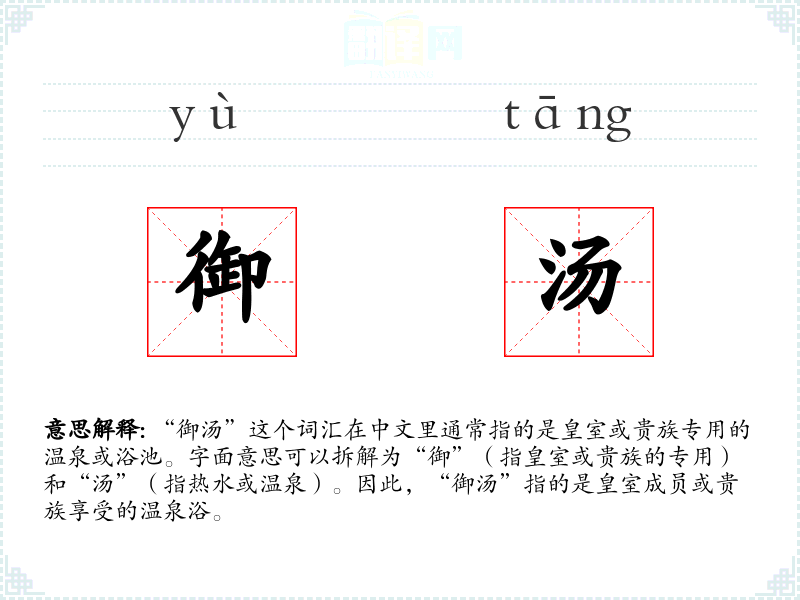 “御汤”这个词汇在中文里通常指的是皇室或贵族专用的温泉或浴池。字面意思可以拆解为“御”(指皇室或贵族的专用)和“汤”(指热水或温泉)。因此,“御汤”指的是皇室成员或贵族享受的温泉浴。