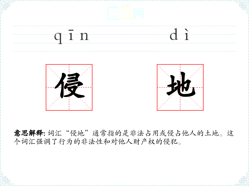 词汇“侵地”通常指的是非法占用或侵占他人的土地。这个词汇强调了行为的非法性和对他人财产权的侵犯。