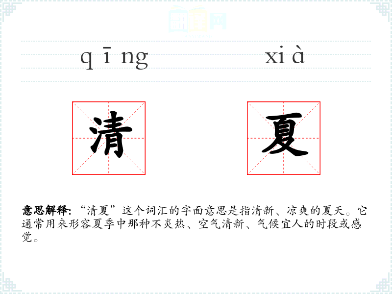 “清夏”这个词由“清”和“夏”两个字组成。“清”字有清洁、清新之意,“夏”字代表夏季。这个词可能是在描述夏季气候时,为了强调其不同于炎热夏天的特点而形成的。