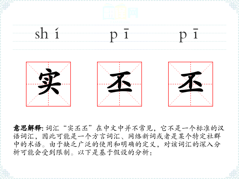 由于“实丕丕”不是一个标准词汇,我们无法提供确切的字面意思和基本含义。它可能是形容词、副词或其他词性,具体含义需要根据上下文来判断。