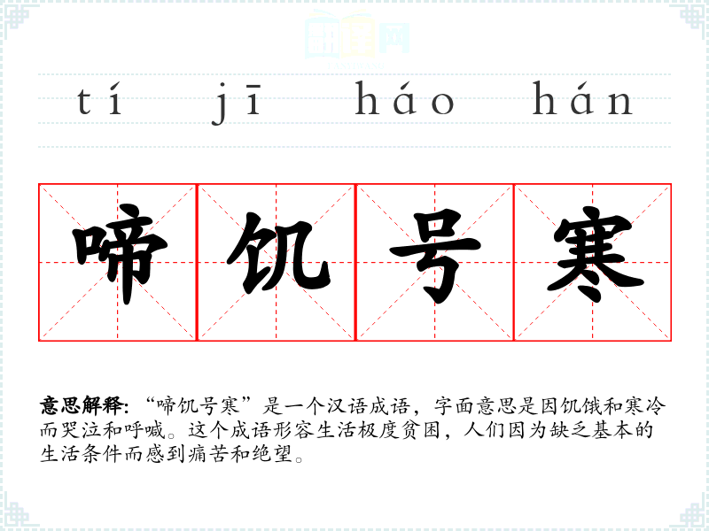 “啼饥号寒”是一个汉语成语,字面意思是因饥饿和寒冷而哭泣和呼喊。这个成语形容生活极度贫困,人们因为缺乏基本的生活条件而感到痛苦和绝望。