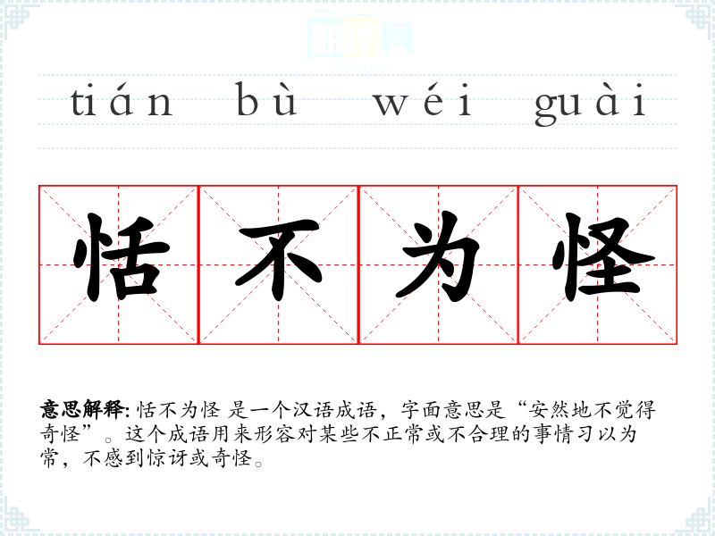 恬不为怪 是一个汉语成语,字面意思是“安然地不觉得奇怪”。这个成语用来形容对某些不正常或不合理的事情*以为常,不感到惊讶或奇怪。