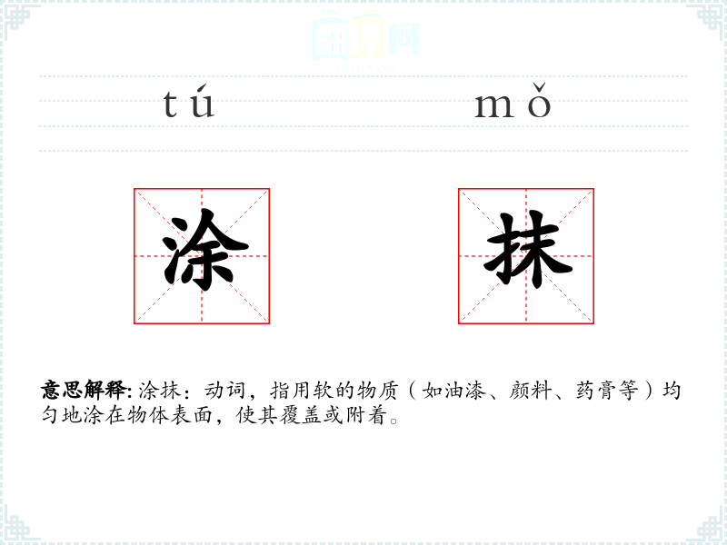 涂抹:动词,指用软的物质(如油漆、颜料、药膏等)均匀地涂在物体表面,使其覆盖或附着。