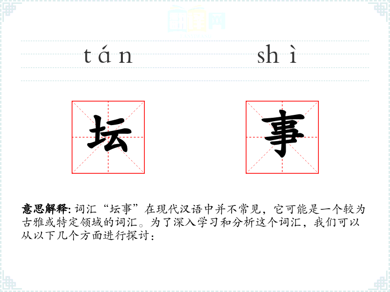由于“坛事”是一个较为古雅的词汇,现代生活中可能不太常用。但如果我们在研究历史或传统文化时,可能会遇到这个词汇,并需要理解其含义。