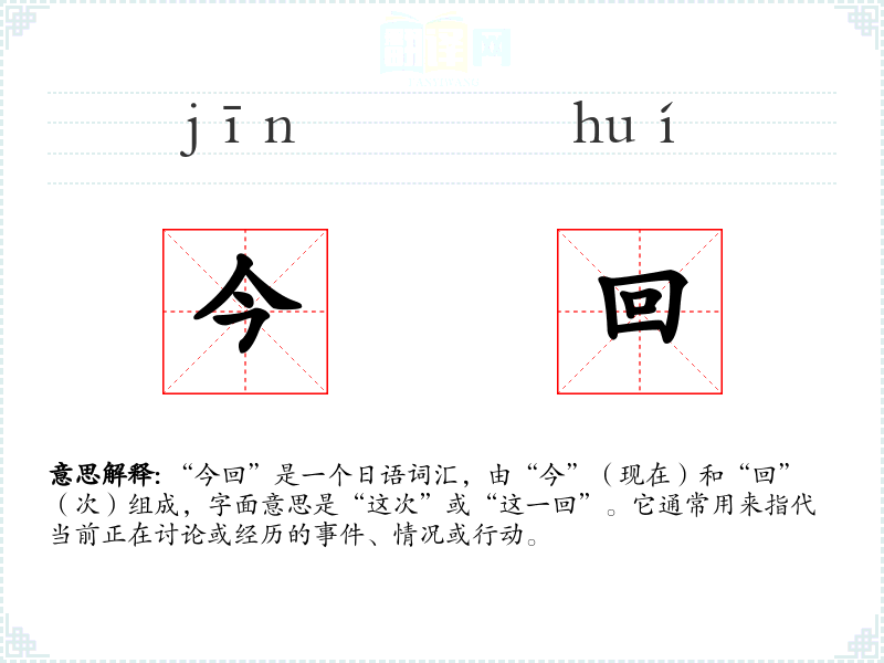 “今回”的词源相对直接,由“今”(现在)和“回”(次)组成。在日语中,这种组合词汇很常见,用于强调当前的时间点或**。