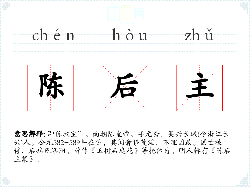 即陈叔宝”。南朝陈皇帝。字元秀,吴兴长城(今浙江长兴)人。公元582-589年在位,其间奢侈荒淫,不理国政。国亡被俘,后病死洛阳。曾作《玉树后庭花》等艳体诗。明人辑有《陈后主集》。