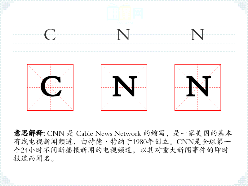 CNN 是 Cable News Network 的缩写,是一家美国的基本有线电视新闻频道,由特德·特纳于1980年创立。CNN是全球第一个24小时不间断播报新闻的电视频道,以其对重大新闻**的即时报道而闻名。