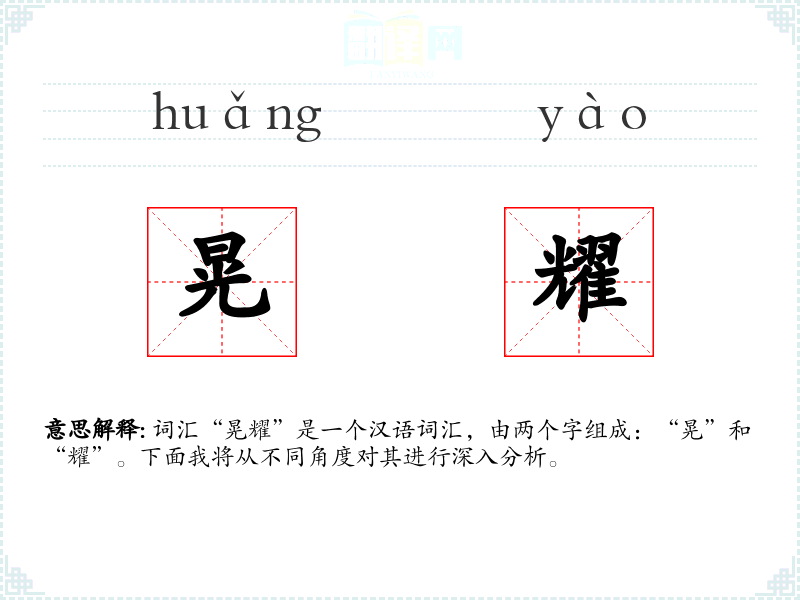 “晃”字古汉语中已有摇动、摆动的意思,“耀”字则有光明、照耀的含义。两者结合,形成了“晃耀”这一词汇,强调光线的强烈和动态的闪烁。