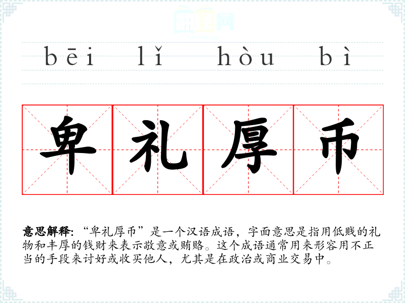 “卑礼厚币”是一个汉语成语,字面意思是指用低贱的礼物和丰厚的钱财来表示敬意或贿赂。这个成语通常用来形容用不正当的手段来讨好或收买他人,尤其是在政治或商业交易中。