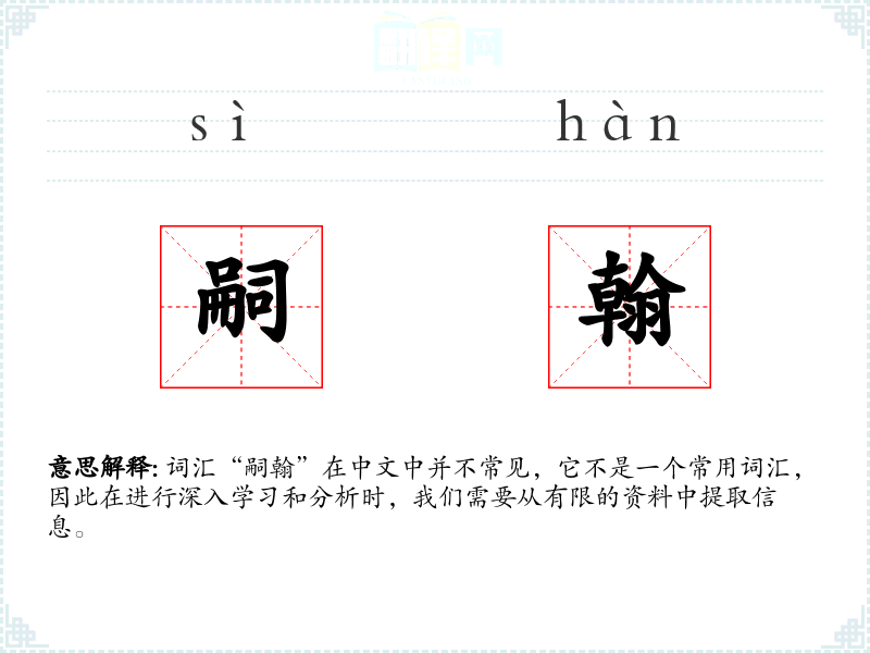 词汇“嗣翰”在中文中并不常见,它不是一个常用词汇,因此在进行深入学*和分析时,我们需要从有限的资料中提取信息。