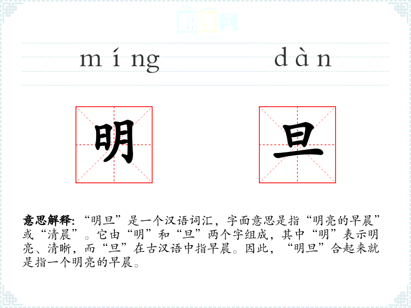 “明旦”是一个汉语词汇,字面意思是指“明亮的早晨”或“清晨”。它由“明”和“旦”两个字组成,其中“明”表示明亮、清晰,而“旦”在古汉语中指早晨。因此,“明旦”合起来就是指一个明亮的早晨。