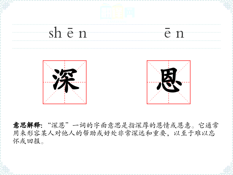 “深恩”一词的字面意思是指深厚的恩情或恩惠。它通常用来形容某人对他人的帮助或好处非常深远和重要,以至于难以忘怀或回报。