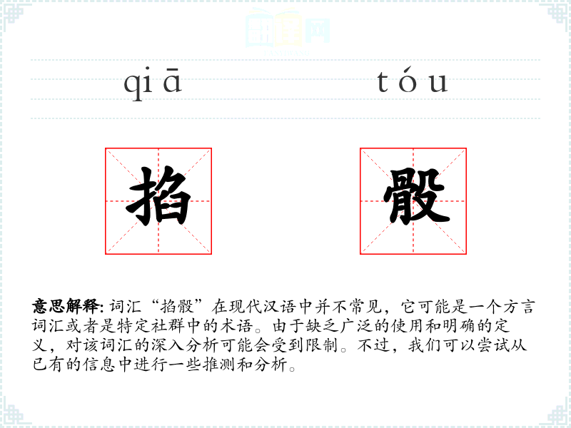 词汇“掐骰”在现代汉语中并不常见,它可能是一个方言词汇或者是特定社群中的术语。由于缺乏广泛的使用和明确的定义,对该词汇的深入分析可能会受到限制。不过,我们可以尝试从已有的信息中进行一些推测和分析。