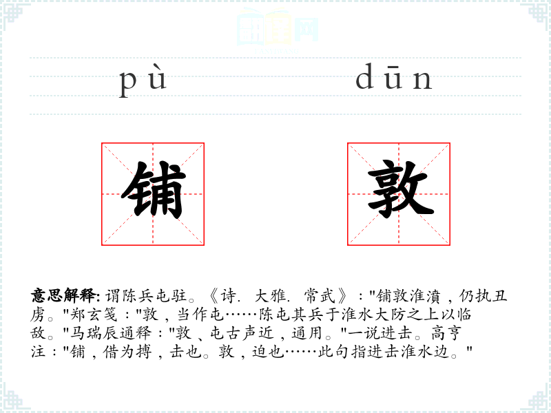 1.谓陈兵屯驻。《诗.大雅.常武》﹕"铺敦淮濆﹐仍执丑虏。"郑玄笺﹕"敦﹐当作屯……陈屯其兵于淮水大防之上以临敌。"马瑞辰通释﹕"敦﹑屯古声近﹐通用。"一说进击。高亨注﹕"铺﹐借为搏﹐击也。敦﹐迫也……此句指进击淮水边。"