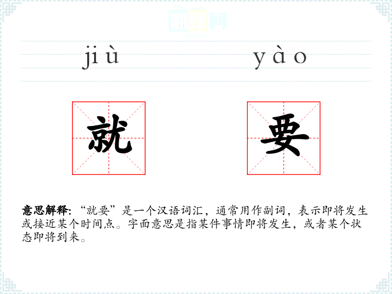 “就要”是一个汉语词汇,通常用作副词,表示即将发生或接近某个时间点。字面意思是指某件事情即将发生,或者某个状态即将到来。