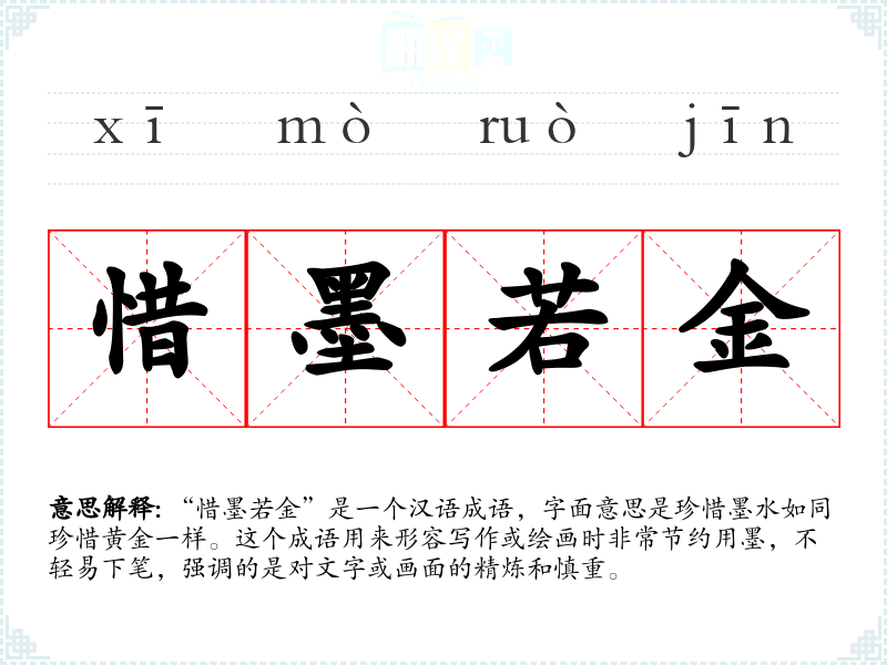 “惜墨若金”是一个汉语成语,字面意思是珍惜墨水如同珍惜黄金一样。这个成语用来形容写作或绘画时非常节约用墨,不轻易下笔,强调的是对文字或画面的精炼和慎重。