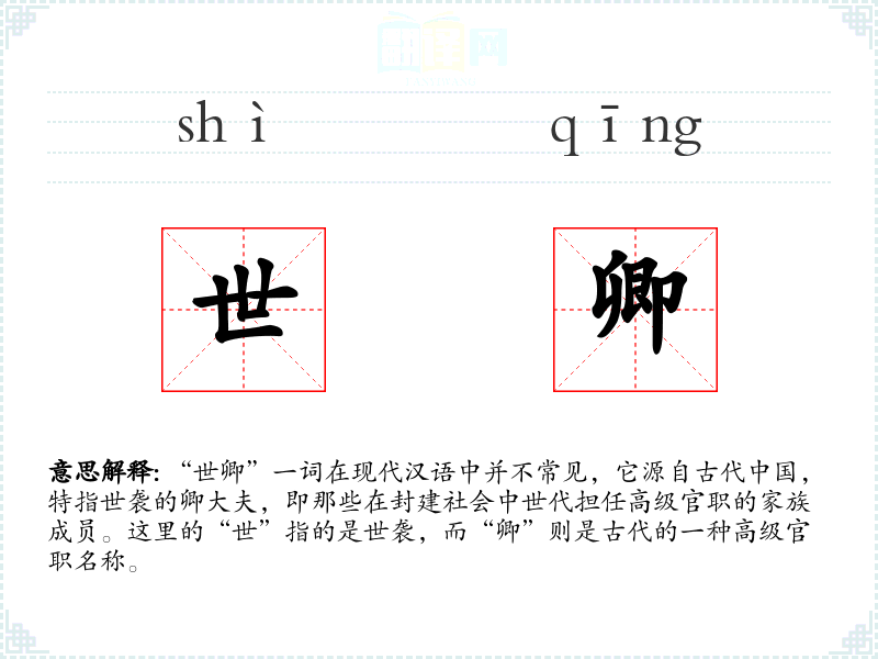 “世卿”一词在现代汉语中并不常见,它源自古代**,特指世袭的卿大夫,即那些在封建社会中世代担任高级官职的家族成员。这里的“世”指的是世袭,而“卿”则是古代的一种高级官职名称。