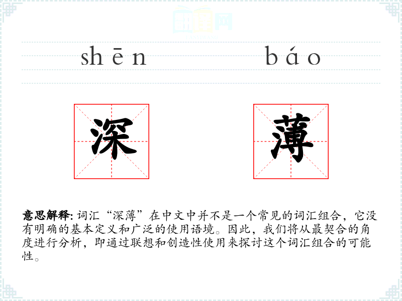 由于“深”不是一个标准词汇,我们无法给出确切的基本定义。但从字面上理解,“深”通常指深度、深奥、深远等含义,而“”则指厚度小、稀、弱等含义。这两个字组合在一起,可能会产生一种对比或矛盾的意味。