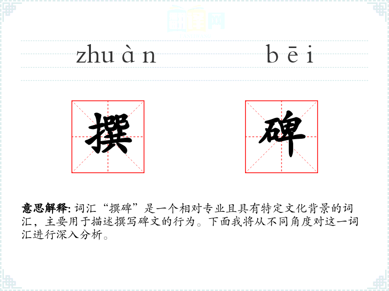 词汇“撰碑”是一个相对专业且具有特定文化背景的词汇,主要用于描述撰写碑文的行为。下面我将从不同角度对这一词汇进行深入分析。