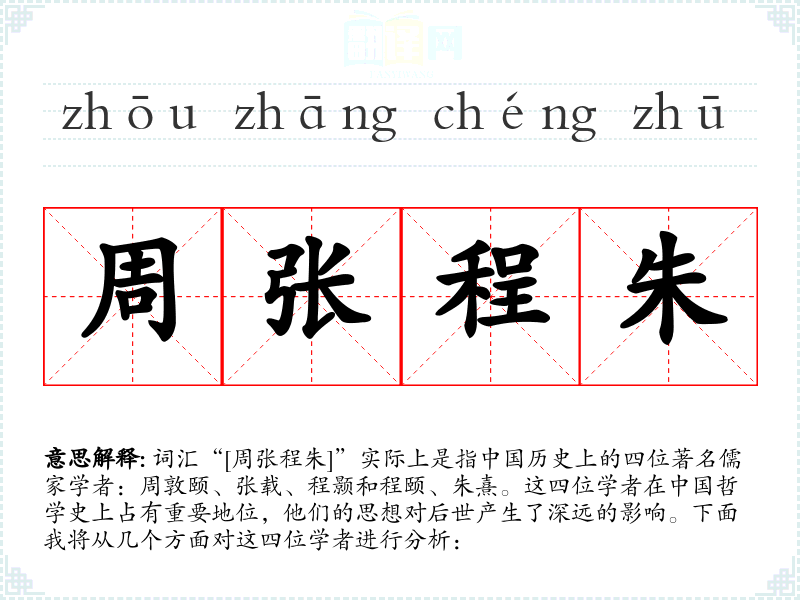 词汇“[周张程朱]”实际上是指历史上的四位著名儒家学者:周敦颐、张载、程颢和程颐、朱熹。这四位学者在哲学史上占有重要地位,他们的思想对后世产生了深远的影响。下面我将从几个方面对这四位学者进行分析:
