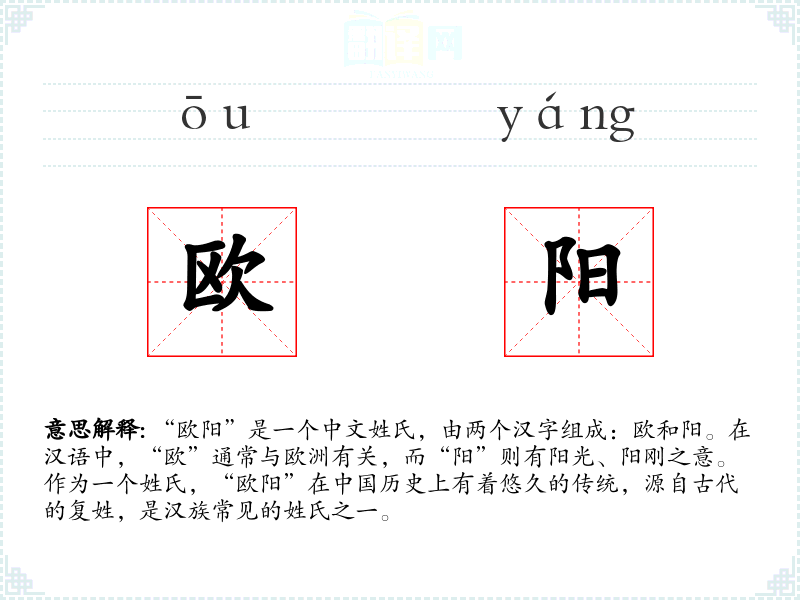 “欧阳”是一个中文姓氏,由两个汉字组成:欧和阳。在汉语中,“欧”通常与欧洲有关,而“阳”则有阳光、阳刚之意。作为一个姓氏,“欧阳”在历史上有着悠久的传统,源自古代的复姓,是常见的姓氏之一。