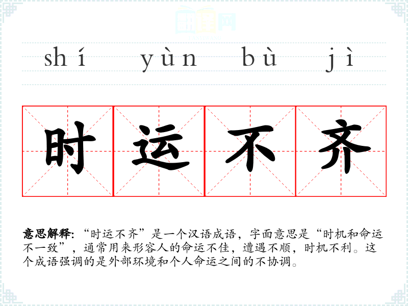 “时运不齐”是一个汉语成语,字面意思是“时机和命运不一致”,通常用来形容人的命运不佳,遭遇不顺,时机不利。这个成语强调的是外部环境和个人命运之间的不协调。