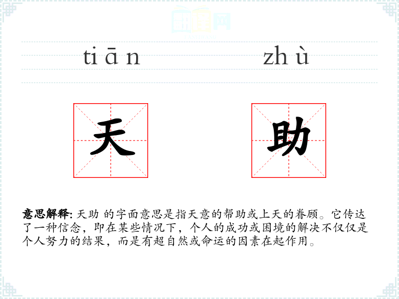 “天助”源自古代的和哲学思想,特别是在儒家和道家的文献中常见。随着时间的推移,这个词逐渐融入日常语言,成为表达对超自然力量信任的一种方式。