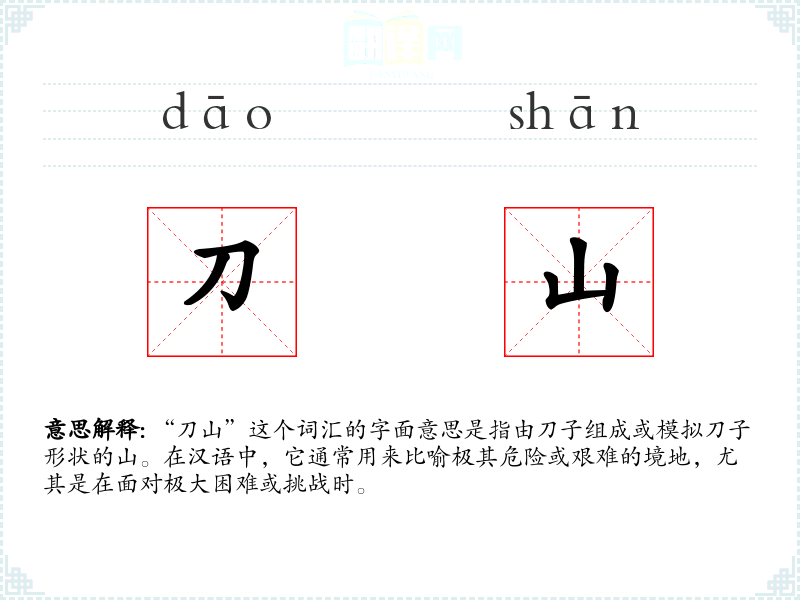 “刀山”这个词汇的字面意思是指由刀子组成或模拟刀子形状的山。在汉语中,它通常用来比喻极其危险或艰难的境地,尤其是在面对极大困难或挑战时。