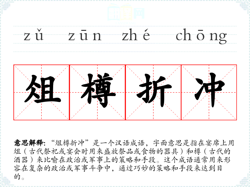 “俎樽折冲”是一个汉语成语,字面意思是指在宴席上用俎(古代祭祀或宴会时用来盛放祭品或食物的器具)和樽(古代的酒器)来比喻在政治或军事上的策略和手段。这个成语通常用来形容在复杂的政治或军事斗争中,通过巧妙的策略和手段来达到目的。