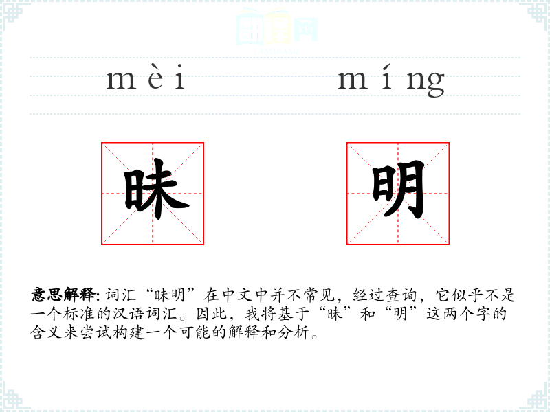 词汇“昧明”在中文中并不常见,经过查询,它似乎不是一个标准的汉语词汇。因此,我将基于“昧”和“明”这两个字的含义来尝试构建一个可能的解释和分析。