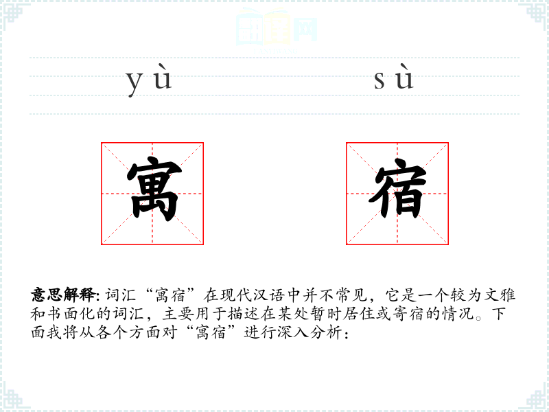 “寓宿”的字面意思是暂时居住在某处,通常指在旅途中或因特殊原因在某地短期居住。其中,“寓”意味着寄居或居住,“宿”则指过夜或住宿。