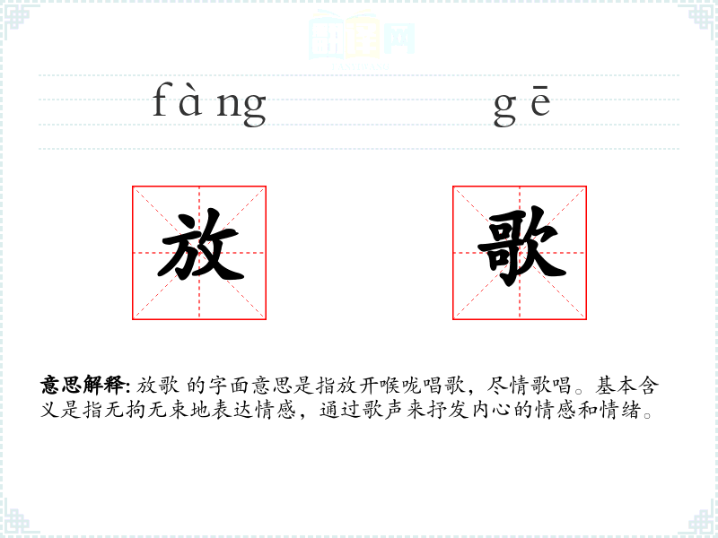 放歌 的字面意思是指放开喉咙唱歌,尽情歌唱。基本含义是指无拘无束地表达情感,通过歌声来抒发内心的情感和情绪。