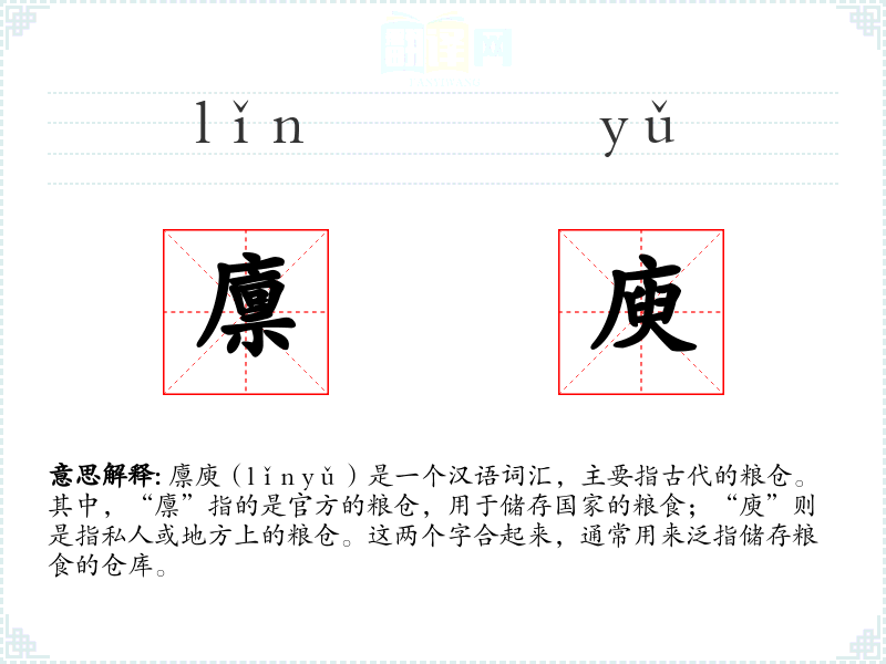 “廪”和“庾”均源自古代汉语,历史悠久。在古代,粮食是国家的重要资源,因此廪庾的管理和状态直接关系到国家的稳定。随着时间的推移,这两个字的使用逐渐减少,但在描述古代社会和经济时仍会使用。