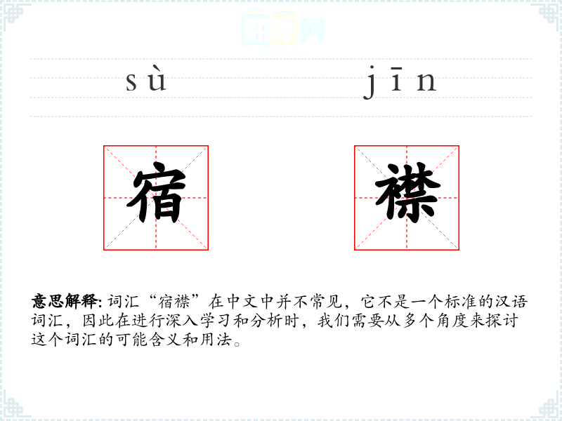 由于“宿襟”不是一个标准的汉语词汇,我们无法给出一个确切的字面意思和基本含义。但是,我们可以尝试从字面上解读: