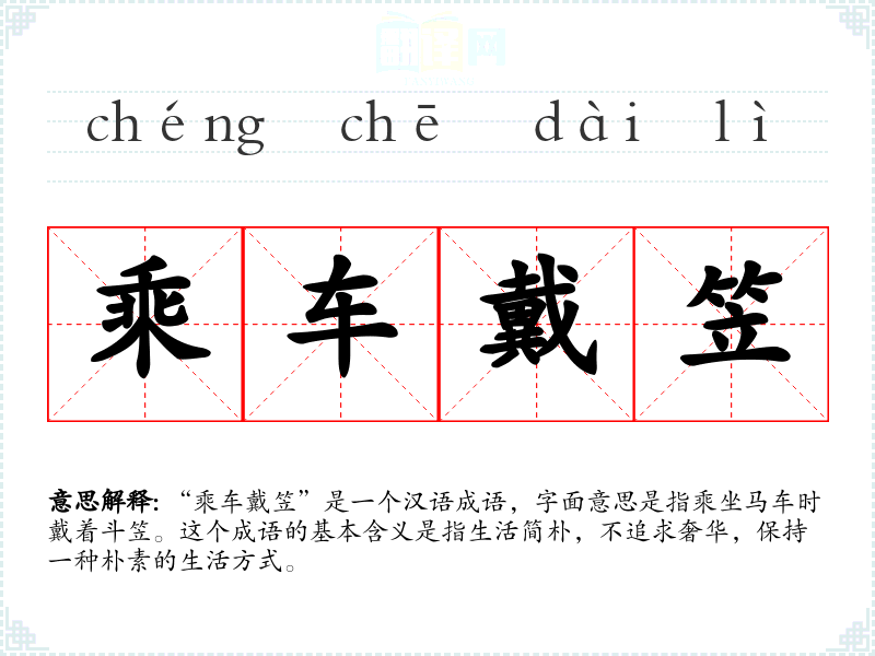 “乘车戴笠”是一个汉语成语,字面意思是指乘坐马车时戴着斗笠。这个成语的基本含义是指生活简朴,不追求奢华,保持一种朴素的生活方式。
