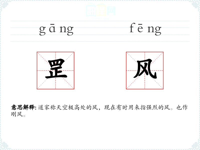 道家称天空极高处的风,现在有时用来指强烈的风。也作刚风。