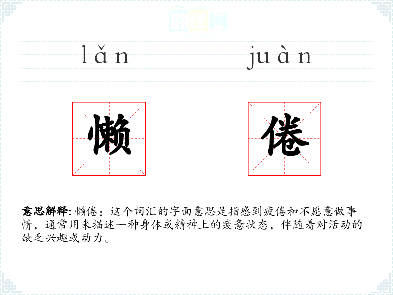 懒倦:这个词汇的字面意思是指感到疲倦和不愿意做事情,通常用来描述一种身体或精神上的疲惫状态,伴随着对活动的缺乏兴趣或动力。