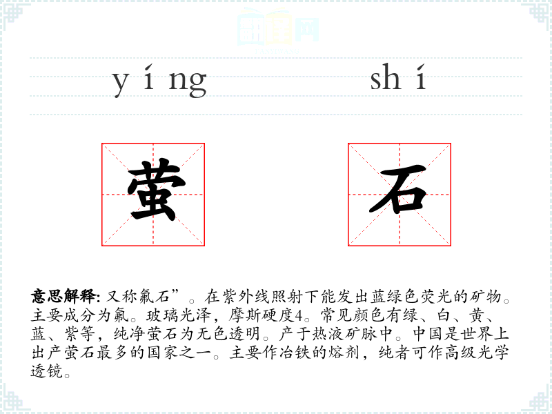 1.又称氟石”。在紫外线照射下能发出蓝绿色荧光的矿物。主要成分为氟。玻璃光泽,摩斯硬度4。常见颜色有绿、白、黄、蓝、紫等,纯净萤石为无色透明。产于热液矿脉中。中国是世界上出产萤石最多的国家之一。主要作冶铁的熔剂,纯者可作高级光学透镜。